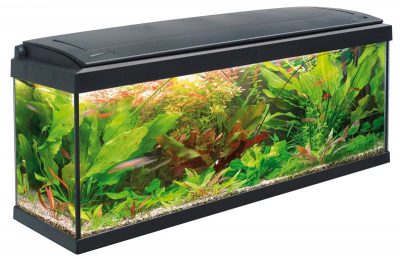 Acquario in vetro completo di coperchio plastico, sistema di illuminazione, filtro biologico, pompa di ricircolo e termoriscaldatore.