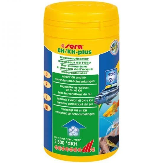 Sera GH/KH-plus aumenta contemporaneamente la durezza carbonatica e la durezza totale dell’acqua nell’acquario. E’ possibile aumentare in modo mirato la durezza dell’acqua di osmosi o di acqua del rubinetto tenera, oppure bilanciare la naturale decomposizione dei componenti di durezza. Inoltre si possono regolare i valori di GH e KH in modo adeguato per l’allevamento di specie di pesci che preferiscono acqua dura.